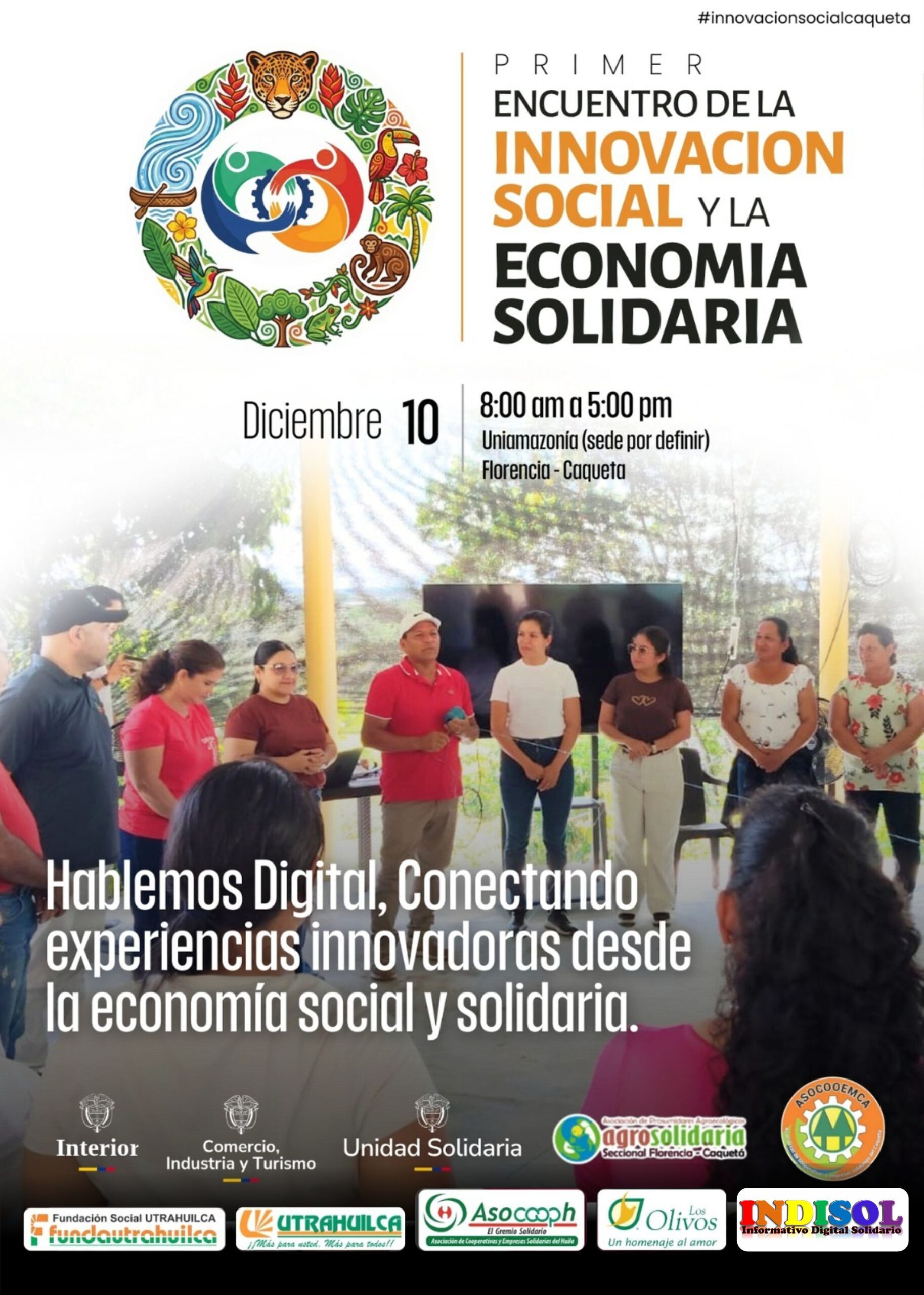 Extendemos invitación fraterna a todas las entidades, asociaciones, cooperativas, fundaciones, organizaciones y procesos comunitarios del departamento para participar en el Primer Encuentro de la Innovación Social y la Economía Solidaria, que se realizará este martes 10 de diciembre en la ciudad de Florencia, Caquetá, en instalaciones de Uniamazonia (sede por confirmar).